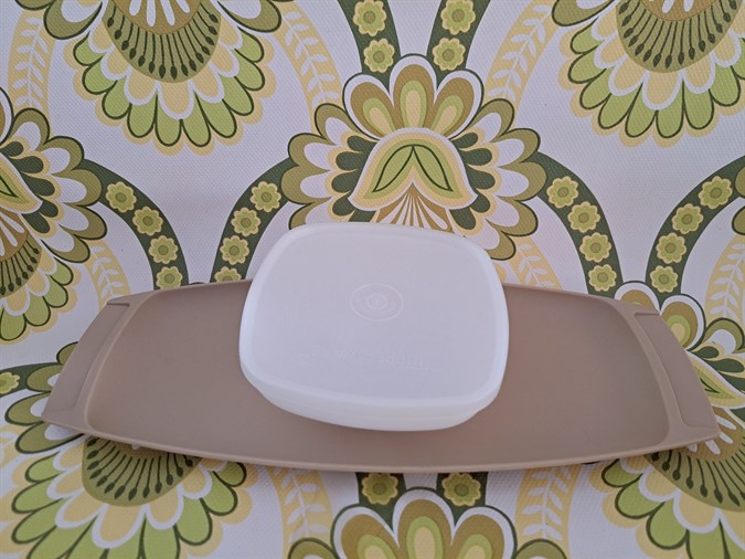 A very handy piece of vintage Tupperware, a 3-piece Serve-Ette set from the 1980s. The rectangular tray is tan, the bowl is white and the lid is opaque. The bowl and tray connect together so that the bowl is secured and won’t slip around while your serving.