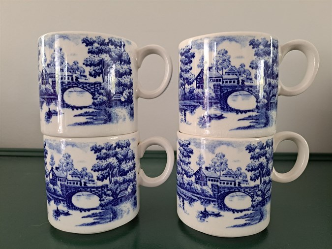 Lovely set of four 4 small vintage coffee or tea cups, mugs, featuring a blue design.
